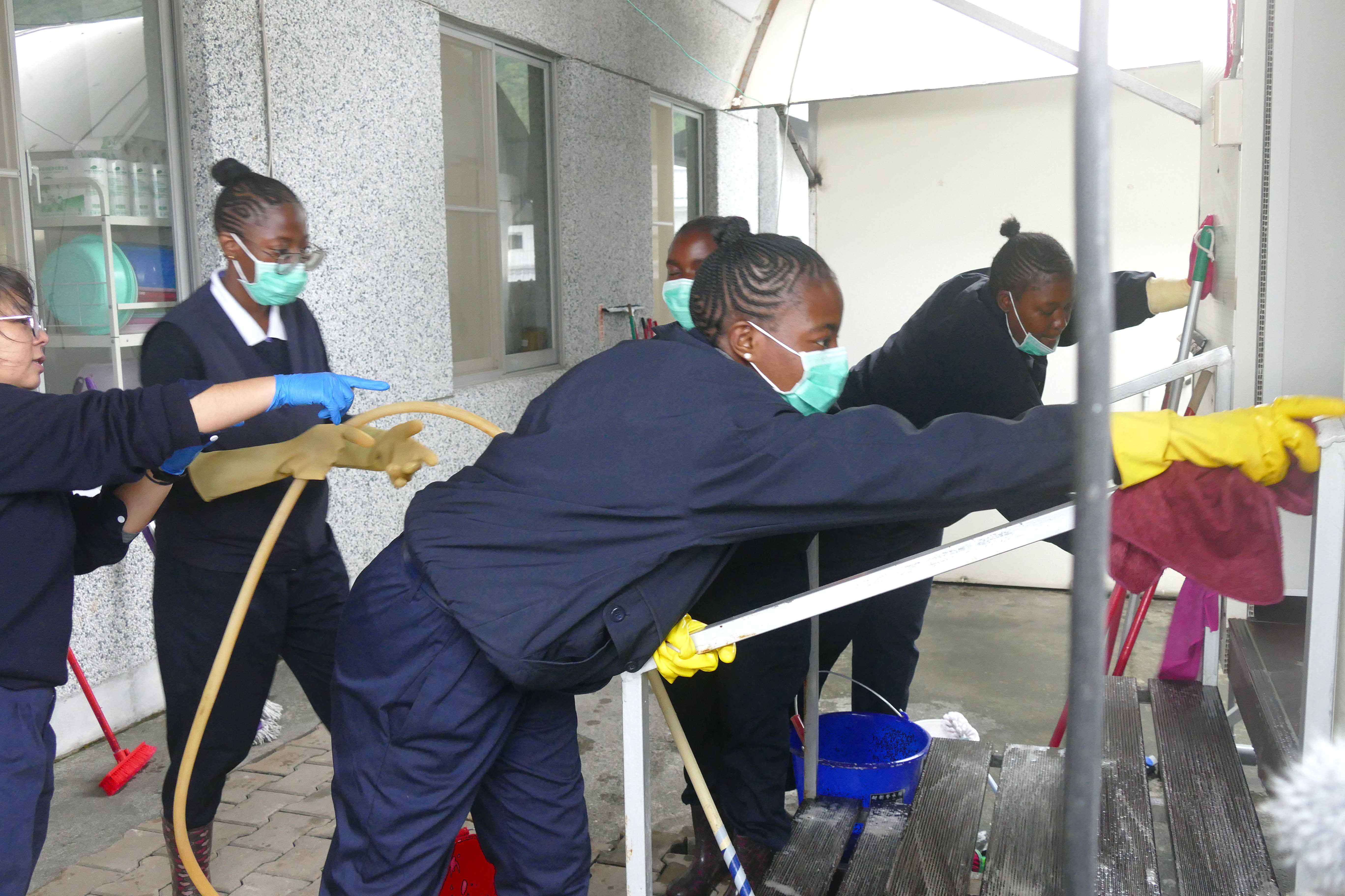 清晨微光中,慈青們自靜思堂徒步前往靜思精舍。完成十公里行腳後,學員隨即投入精舍環境整理。沐浴間裡,新加坡學員王妧如細心擦拭曬衣架;從南非來臺的男女青年,分工合作、同步刷洗精舍頂樓雨後地面,主動承擔善後清潔,動作俐落。