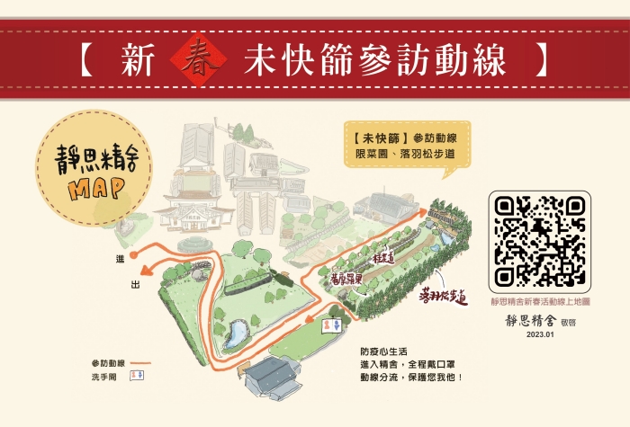 因應防疫政策放寬,今年春節靜思精舍也開放參訪,但在防疫上仍不敢掉以輕心,所以前置的工作人員仍採精簡政策,少少的志工,人人各司其職,安安靜靜地在各角落忙碌著,迎春的喜悅也持續發散⋯⋯