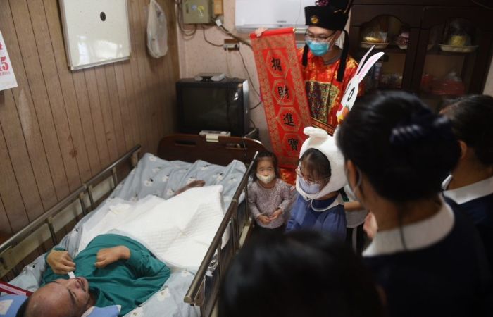 「我們來送年菜了!」訪視志工跟照顧戶的互動如同家人,躺在電動床上的吳先生與一旁陪伴的吳媽媽,看到志工來送年菜都非常的開心。