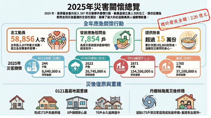 回首2025年,臺灣歷經風雨,從0121嘉義地震的撼動,到丹娜絲、樺加沙等颱風的侵襲,無數家庭的生活在一夕之間面臨考驗。在這動盪不安的時刻,慈濟志工的身影始終在第一時間出現,全年共投入207件災害事件的關懷行動,動員超過58856人次的志工,以愛與關懷,陪伴受災鄉親走過最艱難的時刻。每一個數字背後,都是一個動人的故事。