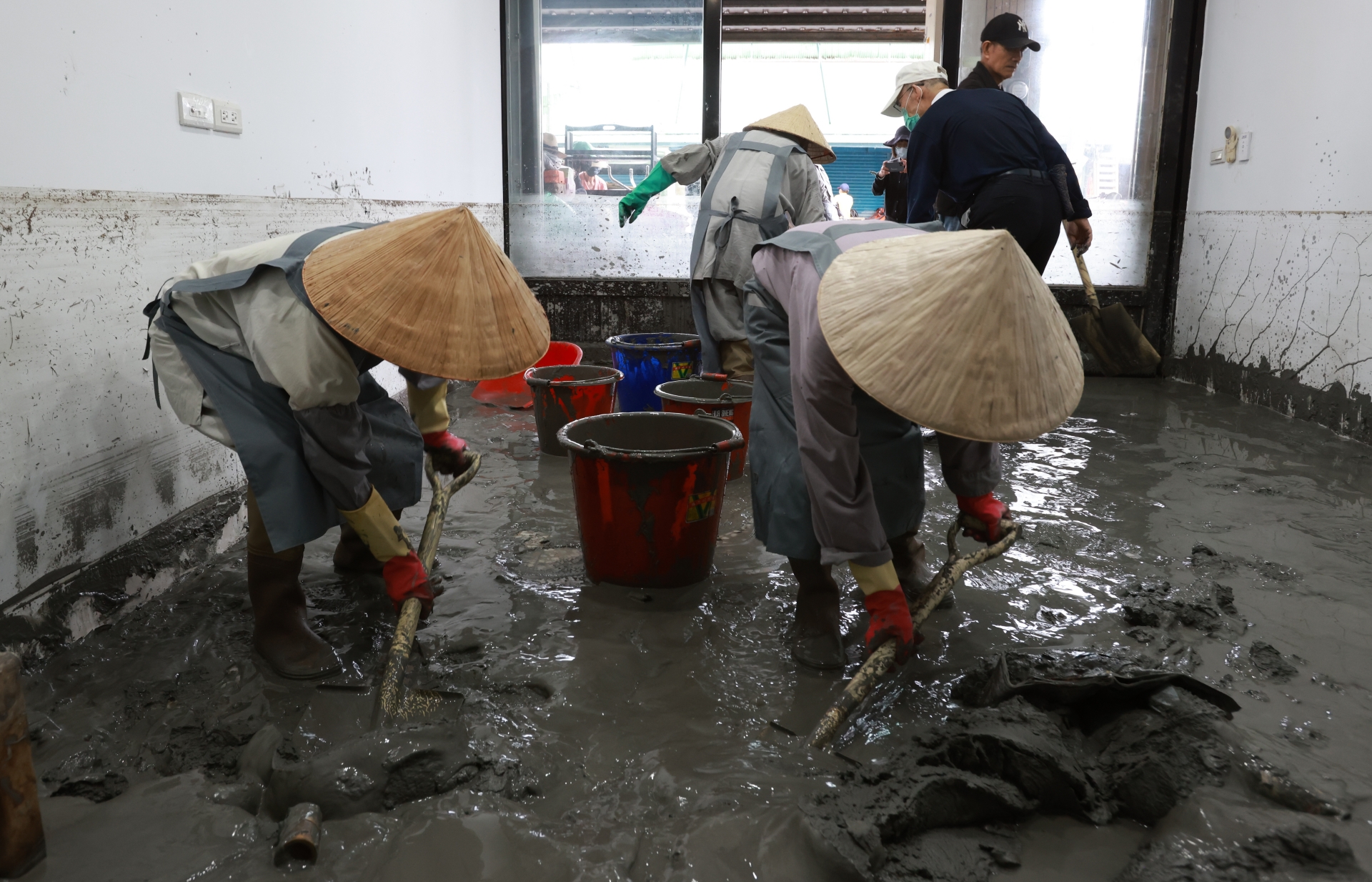 滿地又黑又黏的汙泥又厚又重,法師也與志工並肩鏟泥,汗水與泥水交織下,家園風貌一寸寸還原,而鄉親安心的笑容,是法師們最深切的期盼。