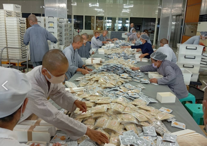 連日來,災區每日湧入數千志工,精舍法師更是志工們堅強的倚靠,他們也投入準備熱食的行列,謙卑地希望熱熱的便當,能為鄉親及志工添一分力量。