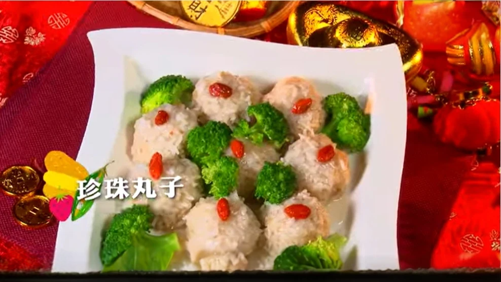 年菜不必繁複,一道「珍珠丸子」便能兼顧口感與營養。以素漿、猴頭菇、荸薺、紅蘿蔔拌入調味料,捏成小球後裹上泡水糯米蒸熟,外觀晶瑩飽滿。搭配燙熟的青花椰菜擺盤,最後以蓮藕粉勾芡淋上,色彩繽紛、口感層次分明。菇類的鮮、荸薺的脆與糯米的Q彈交織,既保有年節喜氣,也多了一份清爽。
