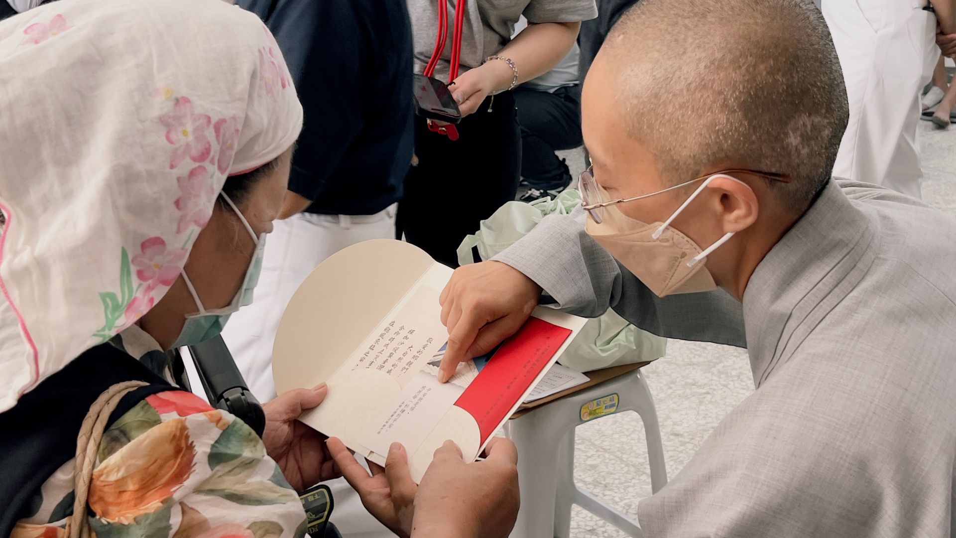 發放這天,王先生和太太以及女兒一起來,一家人在精舍師父的陪伴下,壓抑許久的驚恐,化作淚水,慢慢釋放。慈濟志工陳慕湘說:「在精舍師父溫言軟語的膚慰之下,幾乎所有的災民眼淚再也忍不住。我覺得他們找到了一分依靠,有師父在背後支持,他們安心了。」
