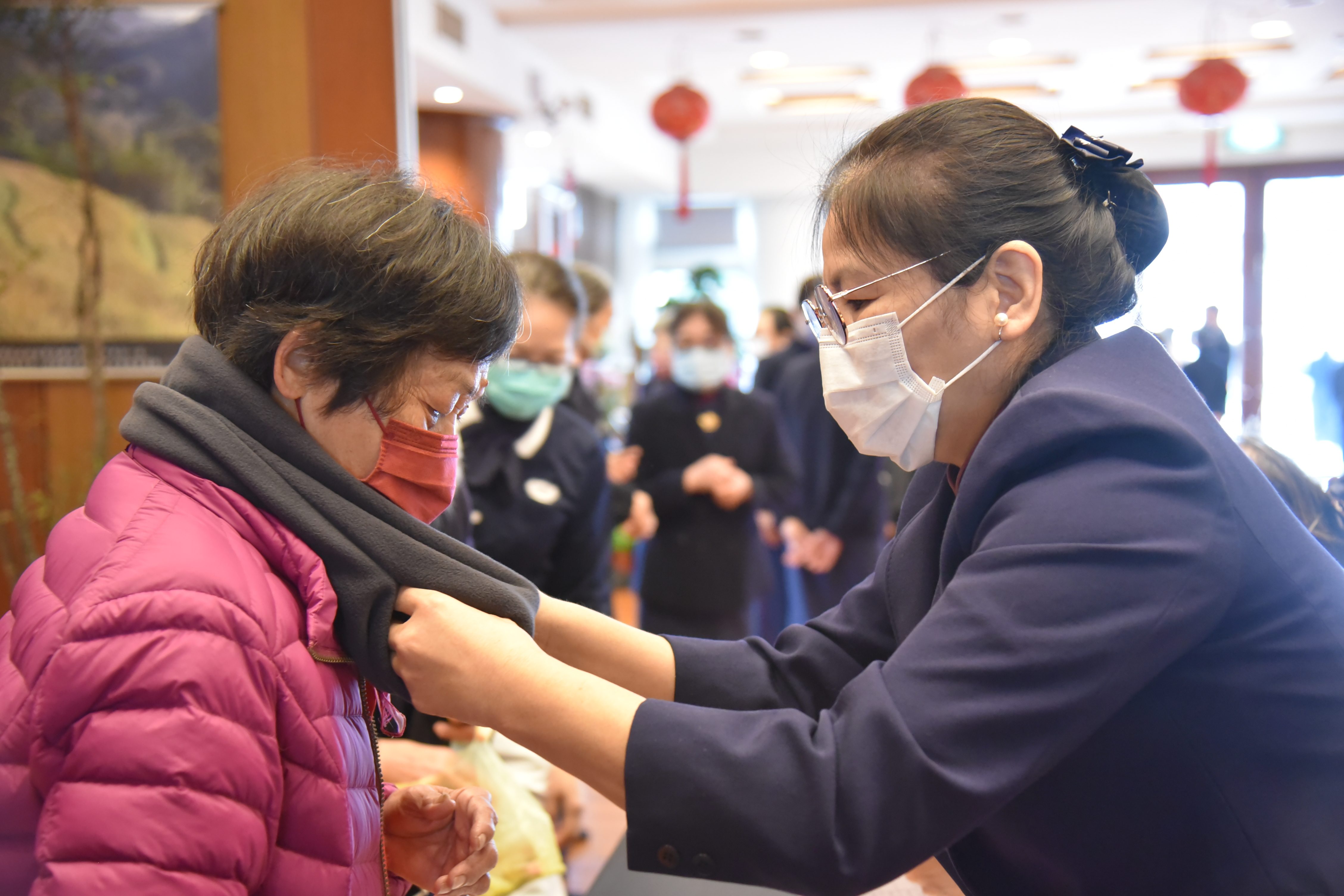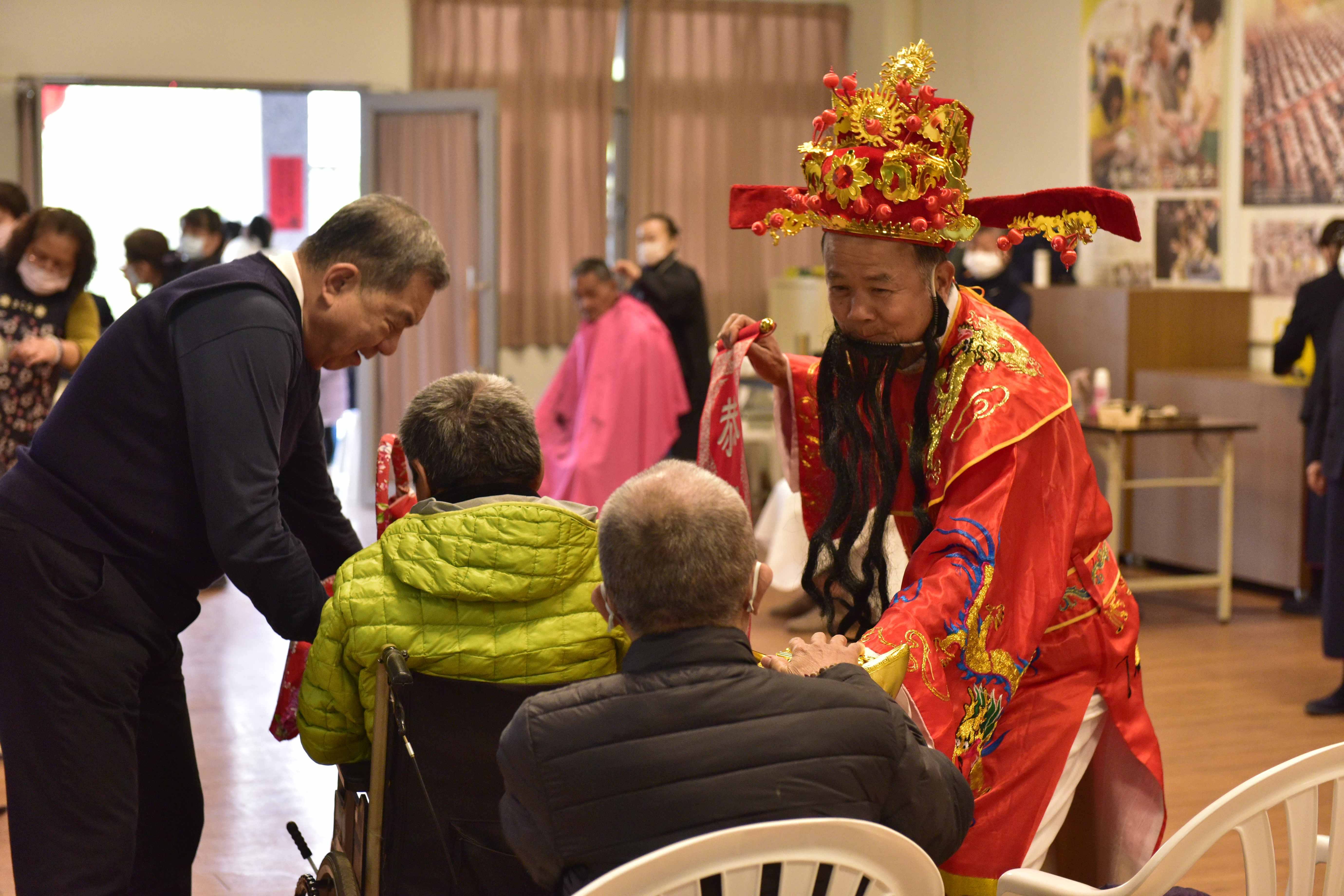 活動現場規劃義剪、義診與年節應景攤位,志工們更親手為到來的長輩與照顧戶圍上圍巾,以細膩的陪伴迎接每一位賓客。這不只是一場餐敘,更像是一年一次的家庭聚會,讓平日孤單的身影,在笑聲中感受到被記得、被需要。