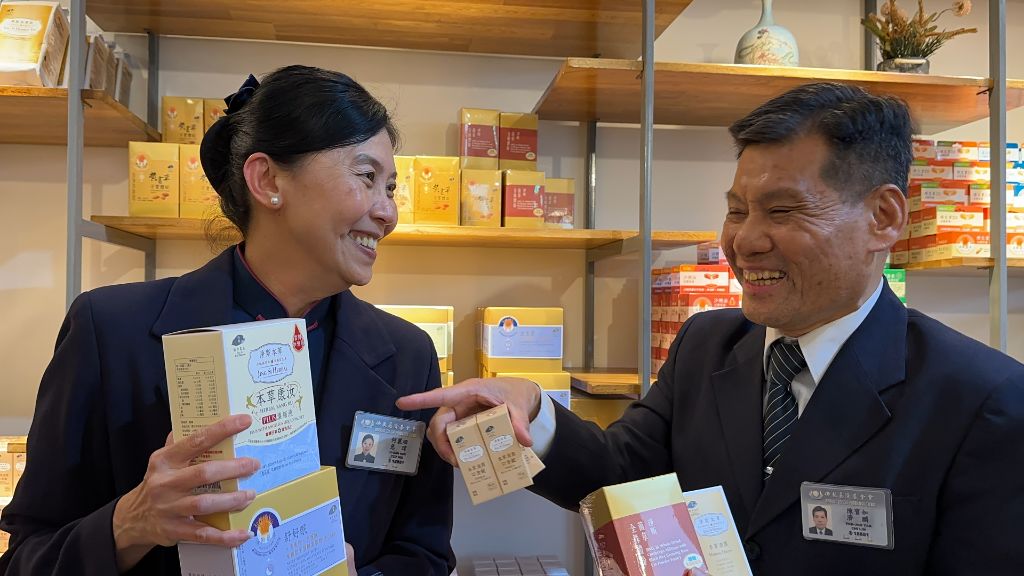 本草生活館內陳列著所有淨斯系列產品,師父強調本草系列是「滋養生命的資糧」,不須特別強調功效,而是讓人從一杯茶到陶藝與展陳細節,都能感受到依循佛法過日子的生活智慧。從美國返臺的陳寶如與何麗珊伉儷,對架上陳列的產品如數家珍,陳寶如笑著説:「我每次回來都會帶本草口含錠,對我的嗓子很有幫助,能緩解火氣旺盛的不適。」