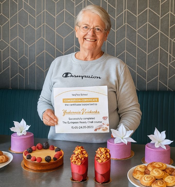 六十四歲的葉芙亨妮婭,在家鄉淪陷後不得不踏上逃難的旅程。已在波蘭生活了三年的她,在今年五月底,完成了烘焙課程並通過考試,順利結業,即將開創屬於自己的小生意。志工也祝福她的未來,像自己的作品一樣,充滿甜蜜的味道。