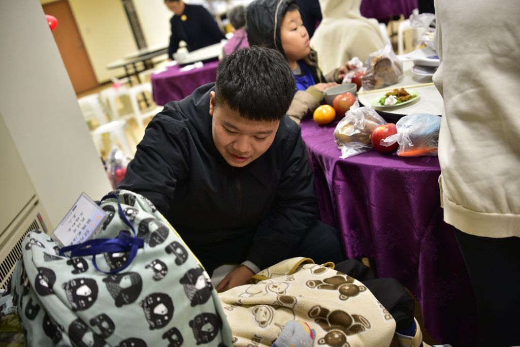 「歡迎回家、歡迎回來……」志工們看見許多照顧戶攜家帶眷踏進福慧廳,親切的笑容、熱情招呼聲此起彼落。他們也回報微笑,以回娘家的心情參加冬令發放祈福會及圍爐。