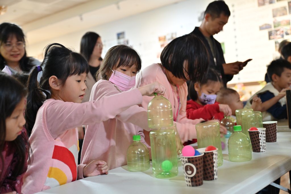 除了義賣,志工賴姿斐更發揮巧思,將寶特瓶、紙箱等廢棄物,變身為有趣的闖關遊戲教具。孩子們在歡笑聲中,深刻體會到資源回收再利用的無限可能。